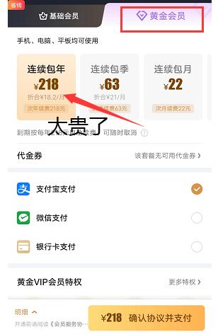 3、接下来,我们选择黄金会员,如下图,你可以根据自己的需要选择适合自己的会员套餐可以连续包年、包季、包月,并且你有多种支付方式选择的。但是在爱奇艺app里面开通太贵了。