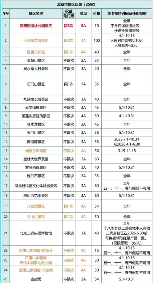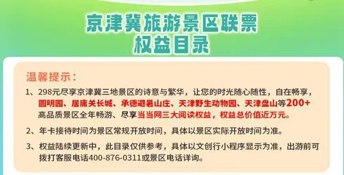 先划重点(性价比必看):京津冀旅游电子卡联票,性价比碾压单独购票,堪称春游“省钱神器”✅ 单人卡298元,可畅游200+家优质景区(含4A、5A景区81家),免票总价值近1万元。联票周末通用、全年可玩,使用日期为激活后一年内有效,春游只要去一次热门景区就直接回本,更贴心的是,联票还附赠当当阅读权益等专属福利,实现“游遍山河+读遍好书”的双重快乐。详细介绍可扫下方海报查看,景区完整目录、票价明细一键可查。