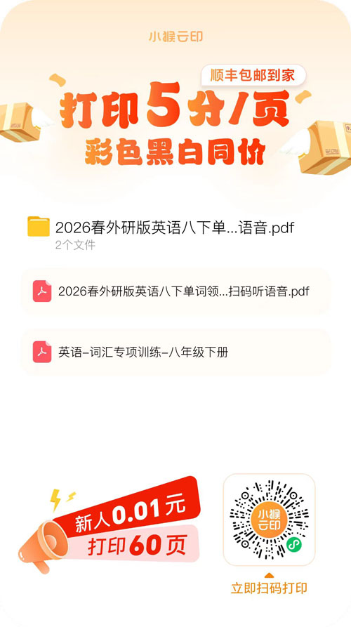 扫描下方海报,即可一键打印2026春外研版英语八下单词领读资料(可同步获取语音领读权限),省钱又省心,帮你轻松搞定单词基础:2026春外研版英语八下单词领读专属打印通道