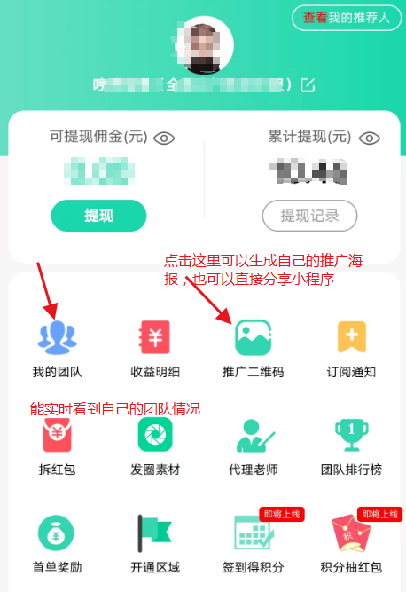 查看推广数据:通过 “我的团队” 入口,可随时查看推广情况、用户绑定状态及收益明细,掌握赚钱进度。