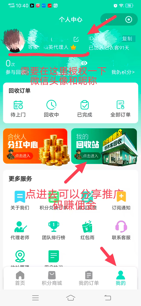 完成授权:进入小程序后,点击 “我的”,找到头像右侧小方框,完成微信昵称和头像授权,未授权则无法获取佣金;