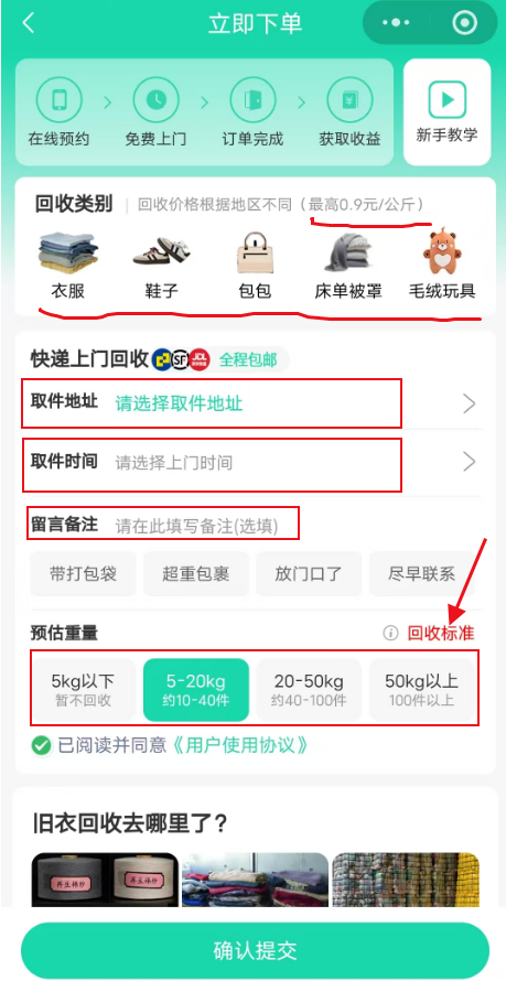 预约下单:客户在小程序点击 “旧衣物回收”,填写上门地址、取件时间及旧衣预估重量即可;