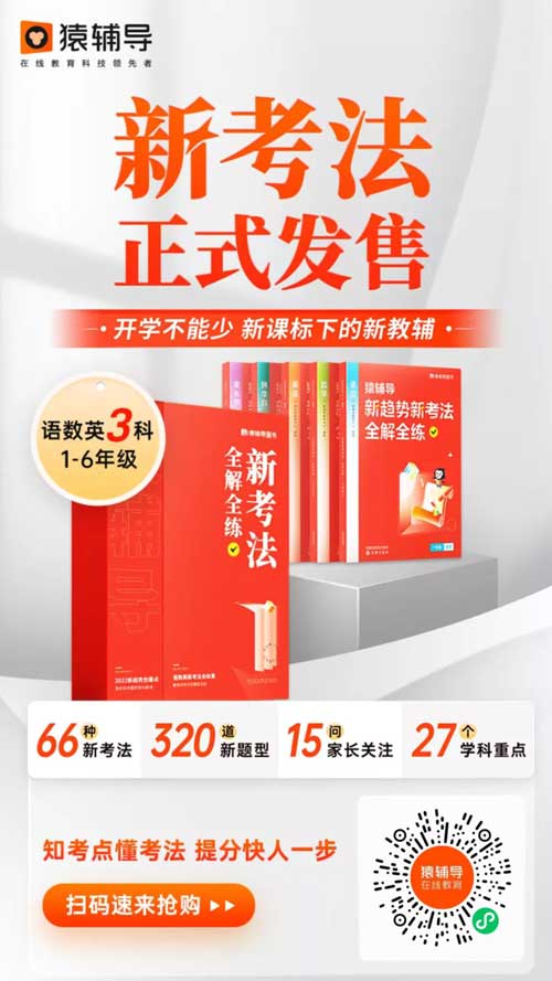 为帮助家长和学生解决更多的困惑和需求,猿辅导将所有关于新课标的趋势研究和题目分析成果沉淀总结,推出《新趋势新考法全解全练》,梳理总结语数英各科趋势,总结出320道新题型,帮家长理解新课标变化,并给出在新时代下教育孩子的实际可落地的方法。
