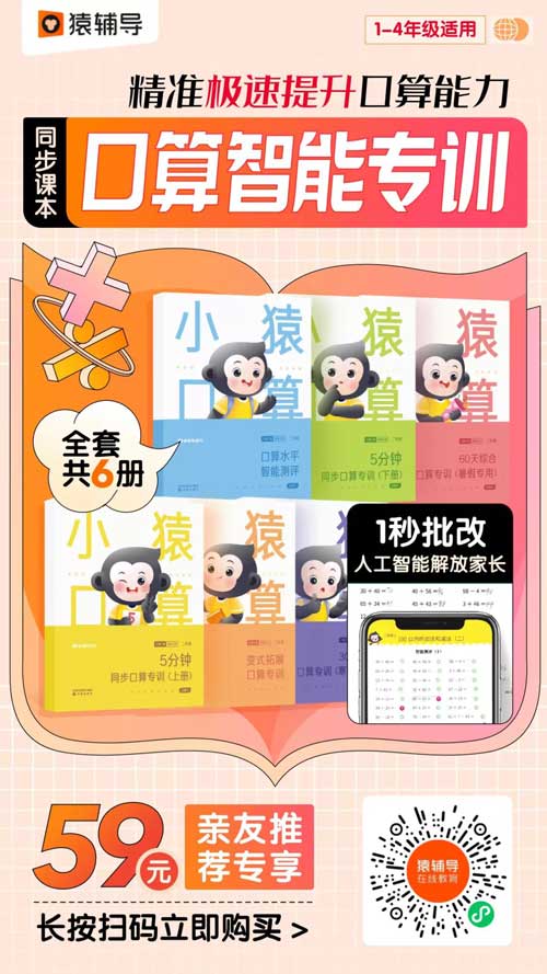 《小猿口算》适用于1-4年级,一套6本,性价比高,算下来一本不到10元。一套贯穿上下2个学期,可以用一年