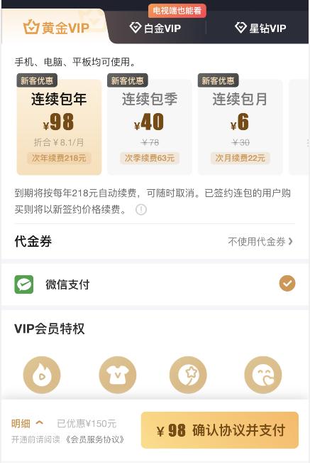 爱奇艺会员针对新人用户有一个特殊的福利,那就是低至4折优惠开通,其中首月是6元一个月、季卡是40、年卡是98元一年,虽然一个月6元看着更划算,但是只能享受一个月的时间,第二月就会扣22元了,不管是年卡、季卡还是月卡都是只有第一次开通的时候有优惠。