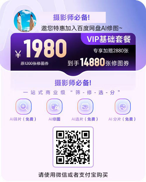 4、百度网盘AI修图VIP专享套餐仅4980元,到手46800张修图券