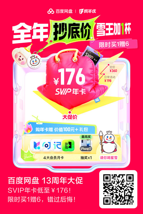 🔥全体注意!百度网盘 13 周年庆尖叫大促2025年11月12日 10 点正式开启!从 11.12 10 点到 12.3 24 点,为期 22 天的福利狂欢,错过再等一年!